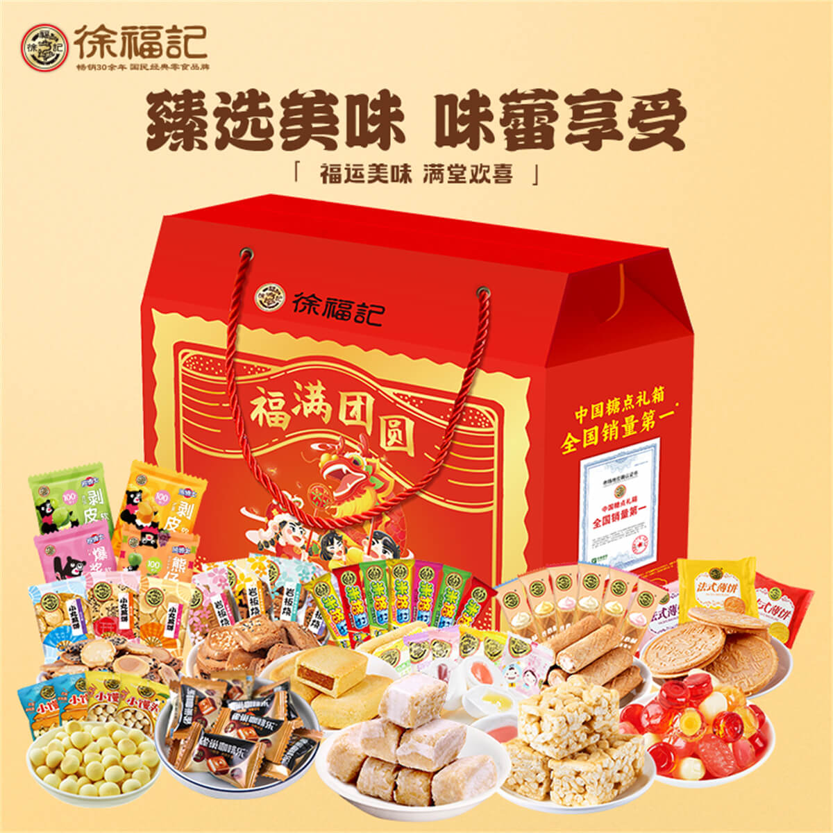 福滿團圓 發布時間:2025-01-04點擊:34 團購優惠請聯系我們 內容物:1:徐福記酥心糖150克*2袋2:徐福記沙琪瑪418克3:徐福記新年什錦糖120克*2袋4:100%果汁軟糖120克*2袋5:米格瑪110克*2袋6:徐福記鳳梨酥200克7:雀巢咖啡樂(罐裝)92g8:徐福記棉花糖242克9:徐福記綜合餅點200克*2袋(小丸煎餅、巖板燒、京屋果子、卷心酥、法式薄餅等) 請填寫您的信息 提交留言