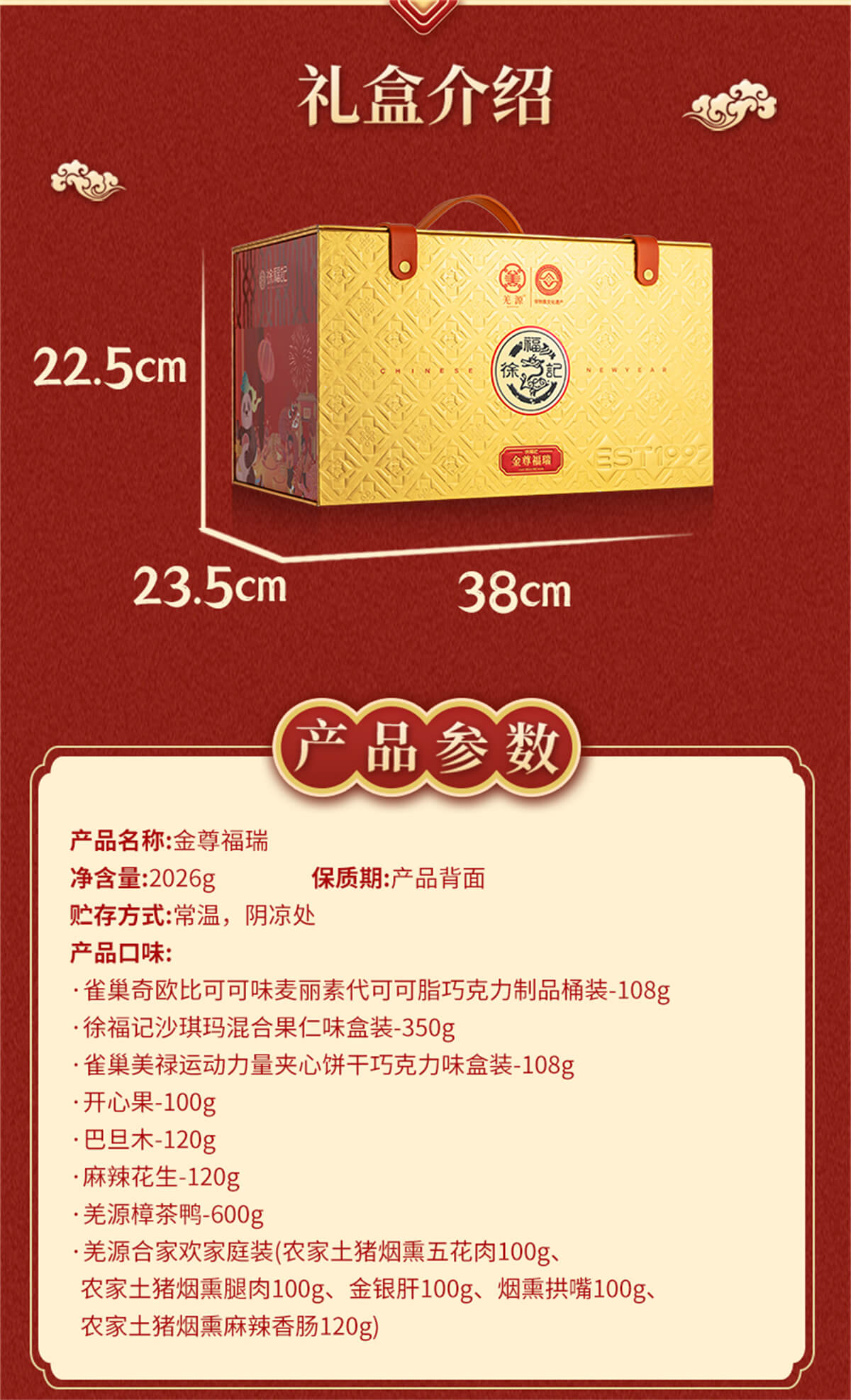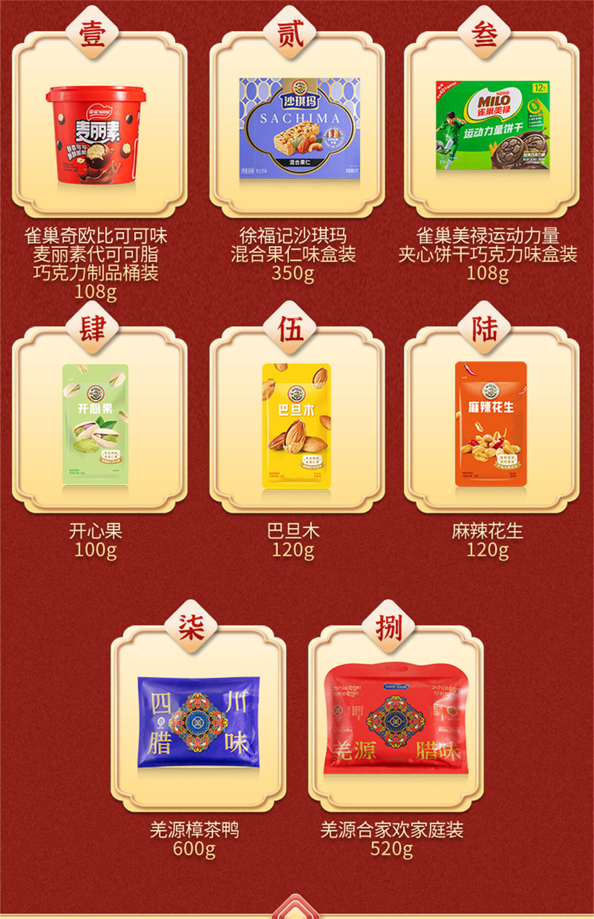 金尊福瑞 發布時間:2025-01-04點擊:28 團購優惠請聯系我們 內容物:雀巢奇歐比可可味麥麗素代可可脂巧克力制品桶裝108g徐福記沙琪瑪混合果仁味盒裝350g雀巢美祿運動力量夾心餅干巧克力味盒裝108g開心果100g巴旦木120g麻辣花生120g羌源樟茶鴨600g羌源合家歡家庭裝(農家土豬煙熏五花肉100g、農家土豬煙熏腿肉100g、金銀肝100g、煙熏拱嘴100g、農家土豬煙熏麻辣香腸120g) 請填寫您的信息 提交留言